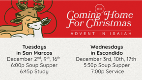 Advent is upon us! Please be sure to join us midweek this December as prepare to celebrate the birth of our Lord. Our series will be “Coming Home for Christmas: Advent in...