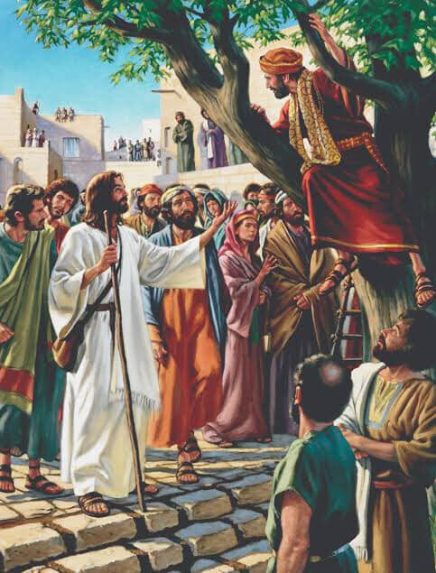 While passing through Jericho, Jesus spots Zacchaeus, a wealthy tax collector, perched in a tree and trying to get a good view of Jesus. After Jesus calls him down and tells him that they are going to his home, Zacchaeus speaks about making financial restitution, and Jesus declares that "salvation has come to this house."